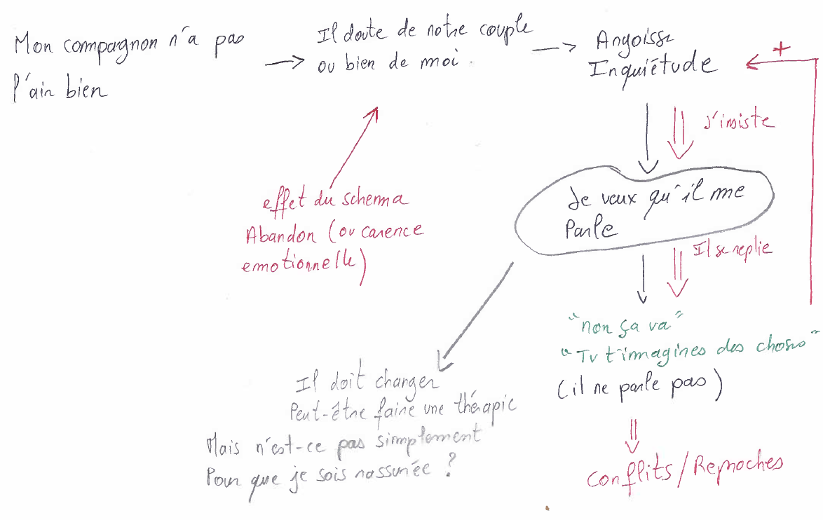 Voyons un exemple de ce que l’on fait en thérapie en utilisant une approche TCC particulière : la thérapie des schémas. Certaines femmes reprochent à leur mari de ne pas assez communiquer, d’avoir des difficultés à exprimer leurs ressentis. Intéressons-nous à une femme qui a identifié chez elle un schéma d’abandon ou de carence émotionnelle. Son schéma de pensée la pousse à sur interpréter certains comportements de son compagnon comme, par exemple, une moue, un silence ou une attitude de retrait. Voici un exemple d’analyse fonctionnelle réalisée avec cette patiente :