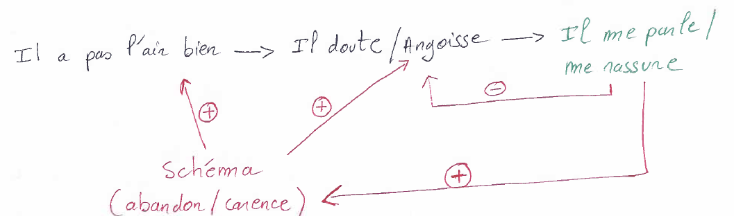 Explication : Notre patiente va d’abord chercher à justifier son interprétation auprès de ses amies, de ses proches (biais de confirmation). Si son compagnon est taciturne (les hommes le sont souvent) on lui confirmera son « diagnostic » : effectivement il n’est pas bien. Mais en son fort intérieur, notre patiente aura surtout des pensées du type : « c’est à cause de moi, il est en train de douter de notre couple, il pense à se séparer etc. » ou encore « j’ai fait quelque chose de mal, il est en colère contre moi »… D’où l’angoisse et le besoin que son compagnon puisse la rassurer. Au fond souhaite-t-elle que son compagnon s’exprime plutôt pour la rassurer ou pour lui-même ?